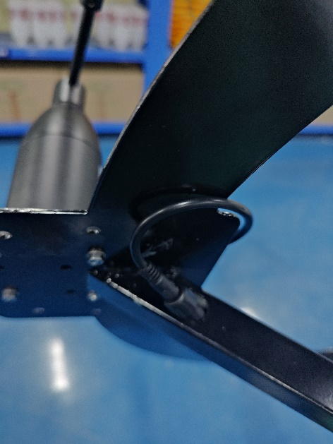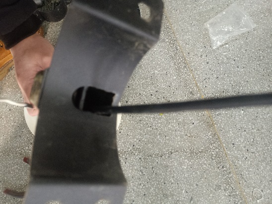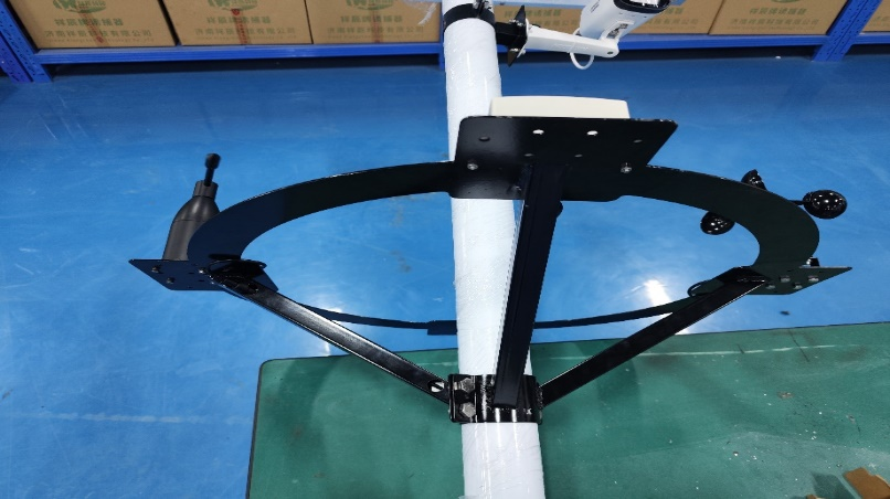 13、安裝固定圓盤支架并穿線,先將圓盤支架中間四個螺絲拆卸,然后將圓盤支架從燈桿上方套到燈桿上,光照傳感器朝向控制箱方向,將傳感器線從對應(yīng)的進線孔(距燈桿頂端1m)穿進燈桿,從控制箱的出線孔(離燈桿底座1.2m)穿出燈桿,最后將圓盤支架4個穿線孔與燈桿的4個進線孔對齊,固定4個螺絲并擰緊,注意不要壓到線