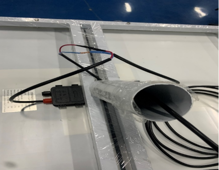 10、電池板接線,注意紅線為正極、黑(藍(lán))線為負(fù)極,兩塊電池板并聯(lián)接到延長線上