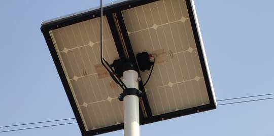 15、安裝固定電池板并穿線,將電池板線從燈桿頂端進線孔穿進燈桿,從控制箱出線孔(離燈桿底座1.2m)穿出,然后將電池板支架套入燈桿內(nèi),固定三個螺絲并擰緊,注意電池板朝向南(以控制箱方向為基準(zhǔn))